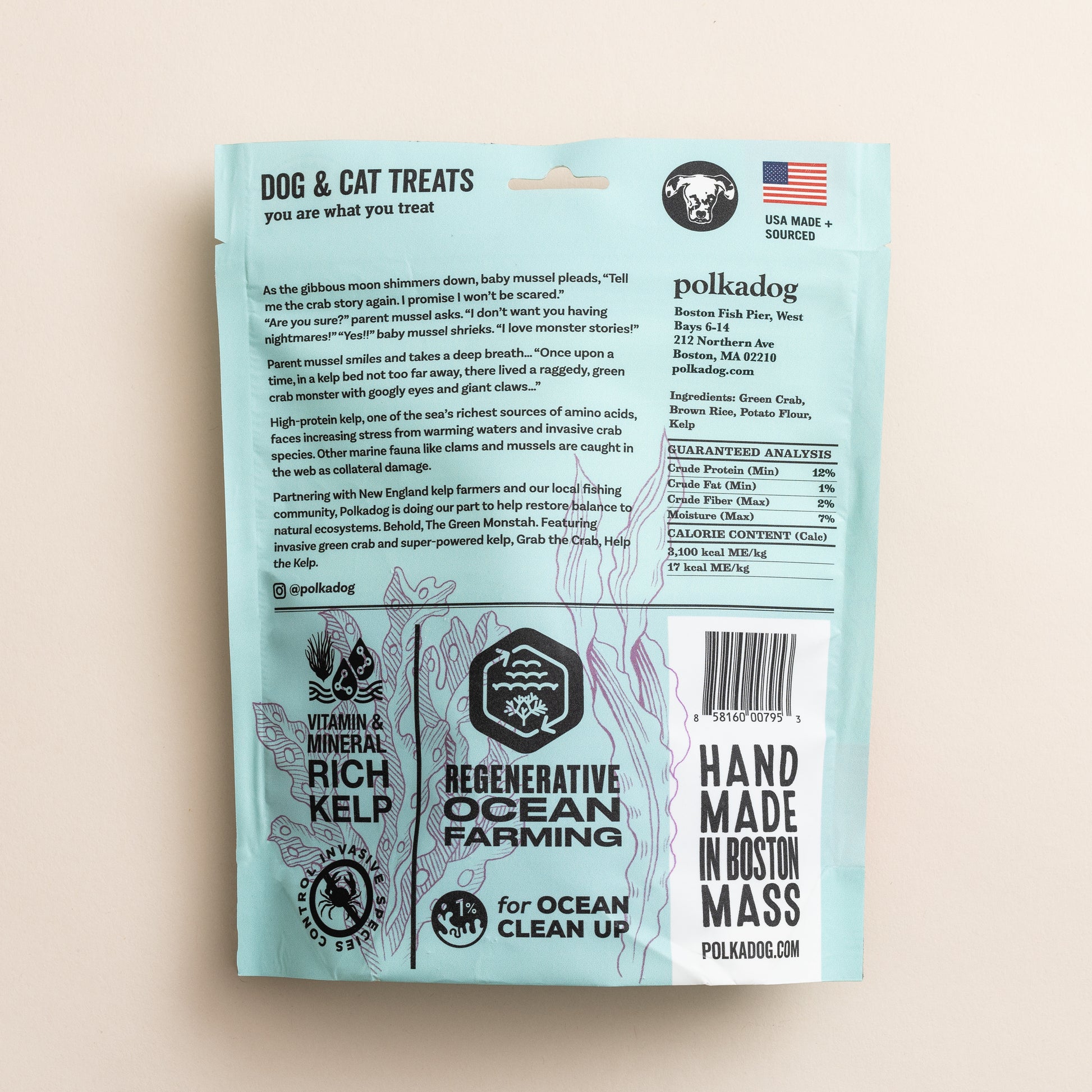 Green Monstah is made from green crab and kelp, two local ultra-rich sources of protein and Omega-3s. And these two ingredients are particularly special. Finding ways to manage the over-abundance of green crab populations in New England waters is the challenge. The reward is the restoration of biodiversity in coastal ecosystems, and the creation of new economic opportunities for local fishers.