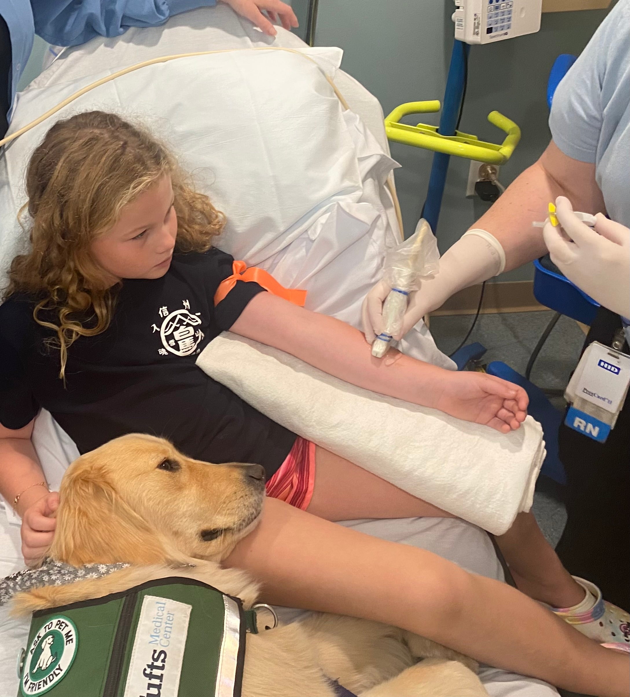 There are so many moments that we have witnessed our facility dogs truly making a difference for patients and their families. However, there are a few that truly stand out. Between seeing a young and active child with autism receive deep pressure from Dorothy during his IV placement and be able to remain still, witnessing Bob place his head at exactly the right moment on a patient's lap when they were receiving difficult news, to seeing the impact Dorothy and Bob have made when escorting children of adult patients into an intensive care unit. Because Tufts Medical Center is an acute care hospital, we tend to see patients that are very sick and need to spend many months at the hospital receiving treatment or waiting for a transplant. Not only is it very difficult for patients to cope, it is also very stressful for their entire family unit.